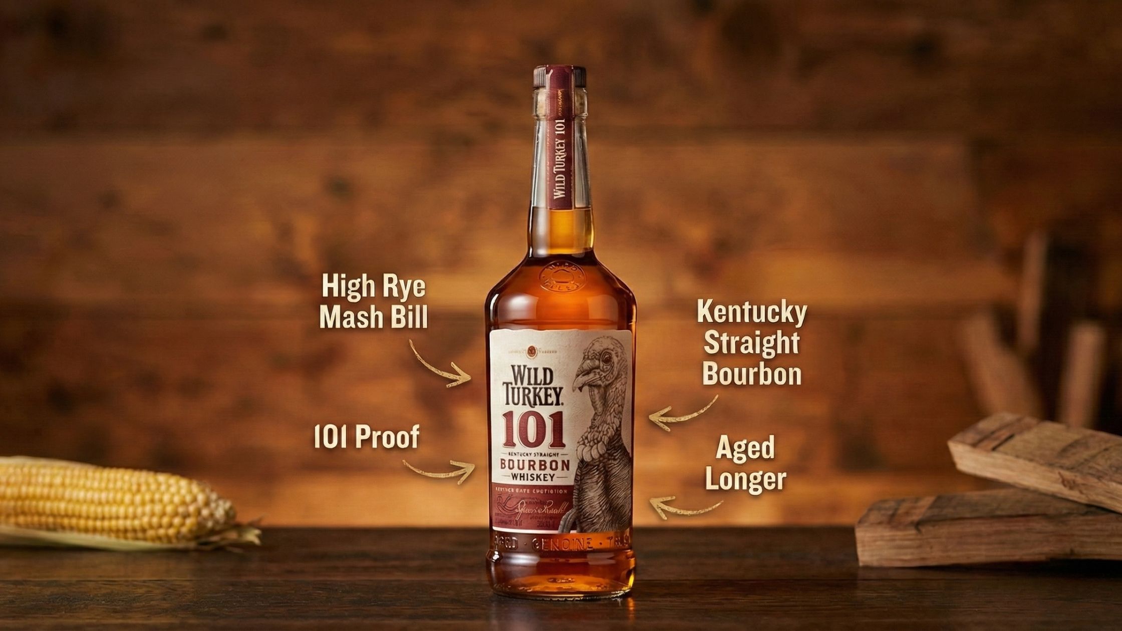 Wild Turkey 101 is a high-proof Kentucky straight bourbon whiskey produced by the legendary Wild Turkey Distillery, now under the Campari Group.