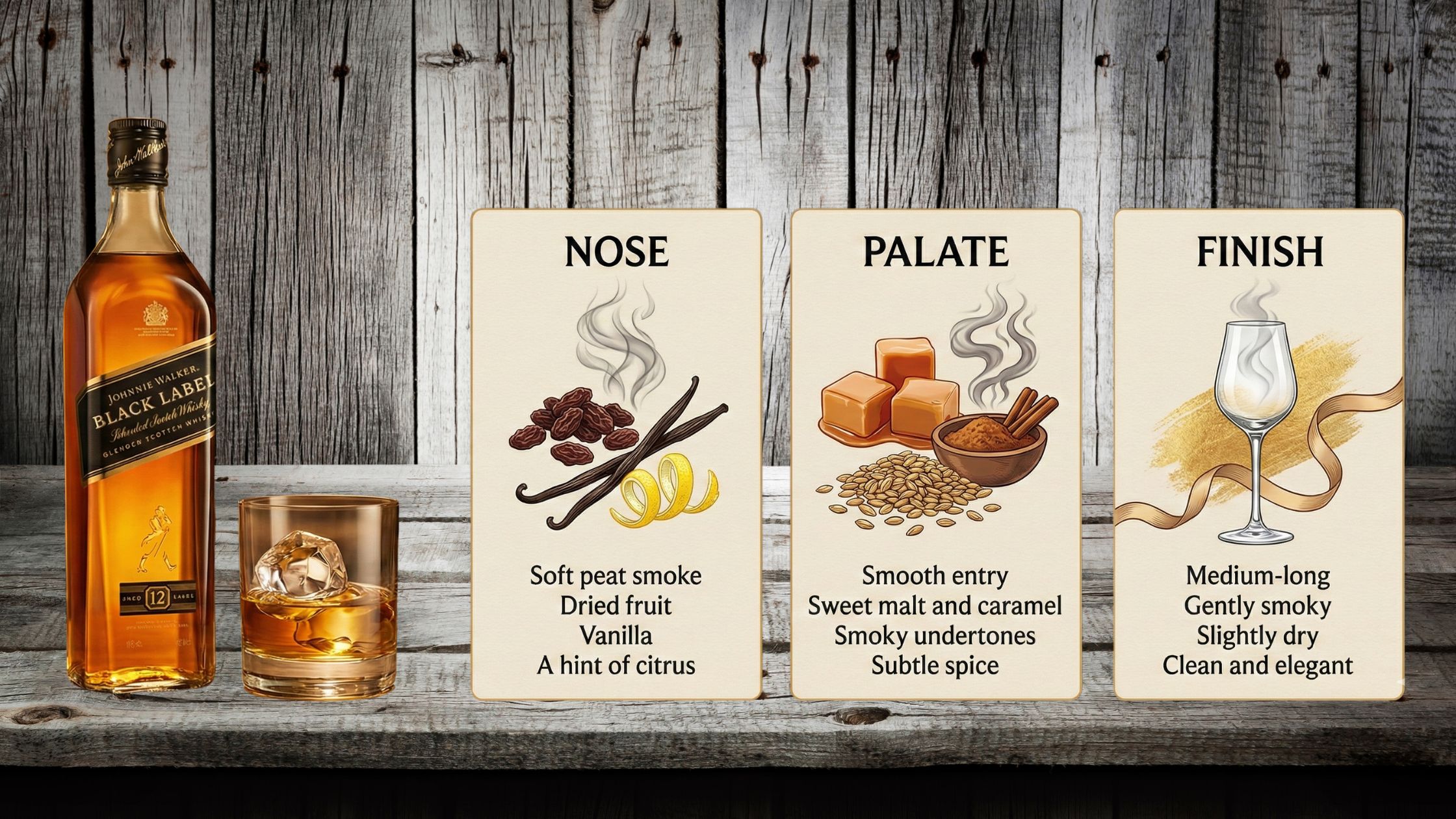 Black Label uses a high malt content, which includes famous smoky malts from Scotland's west coast, instead of following the common pattern used by most blends which depend mostly on grain whisky.