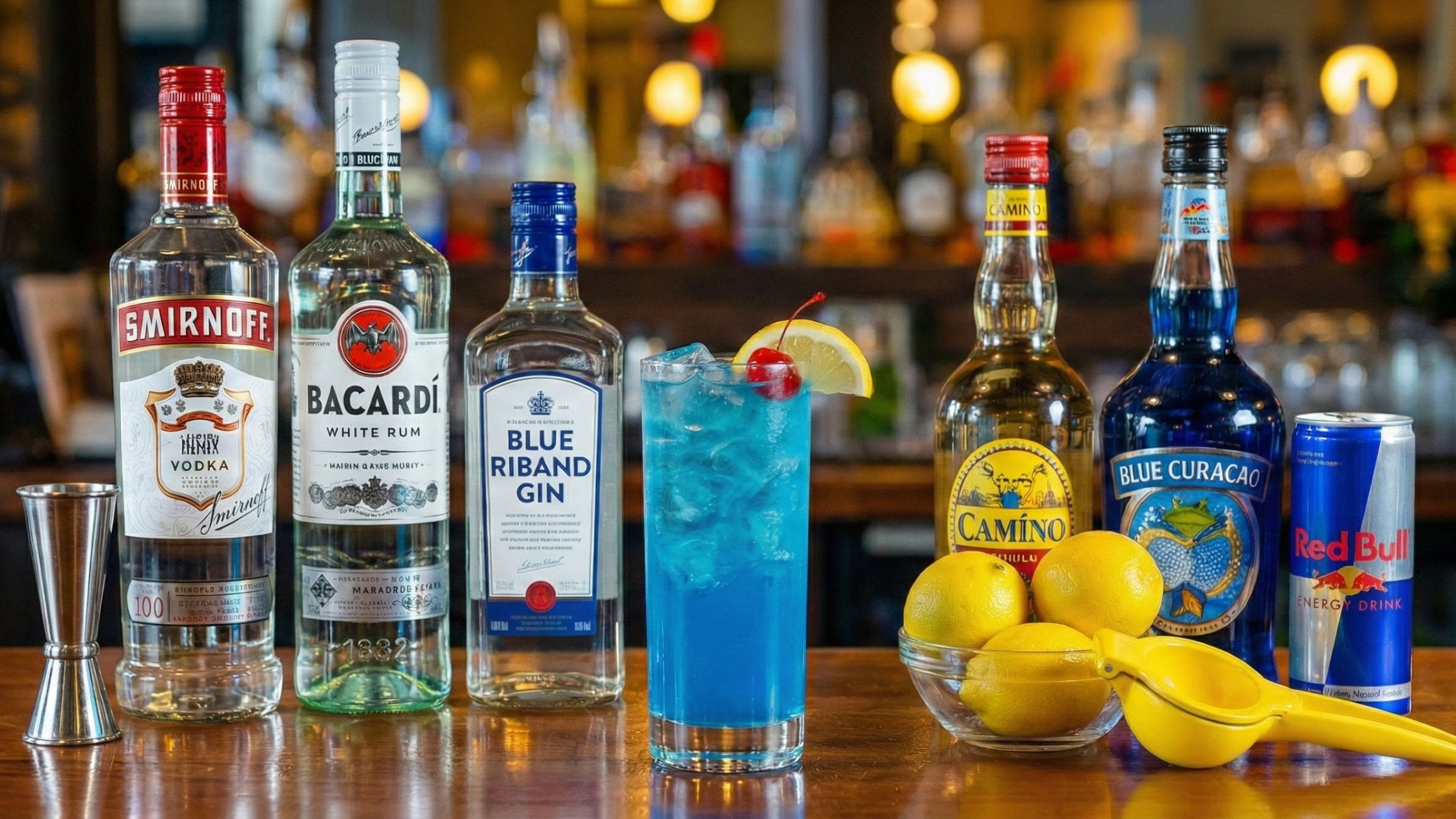To make this at home, you need to raid your bar cabinet. You don’t need top-shelf liquor for this; standard brands work perfectly fine because the Red Bull and Blue Curacao will dominate the flavor.