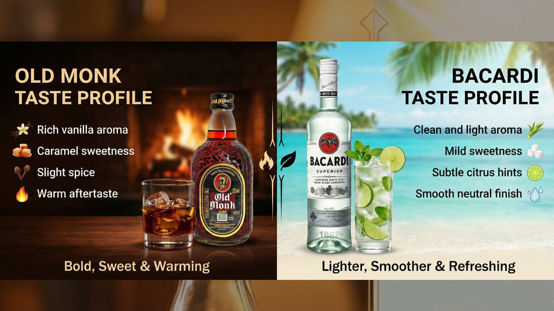 If you prefer bold and sweet warmth, Old Monk wins. If you prefer fresh and clean cocktails, Bacardi wins.